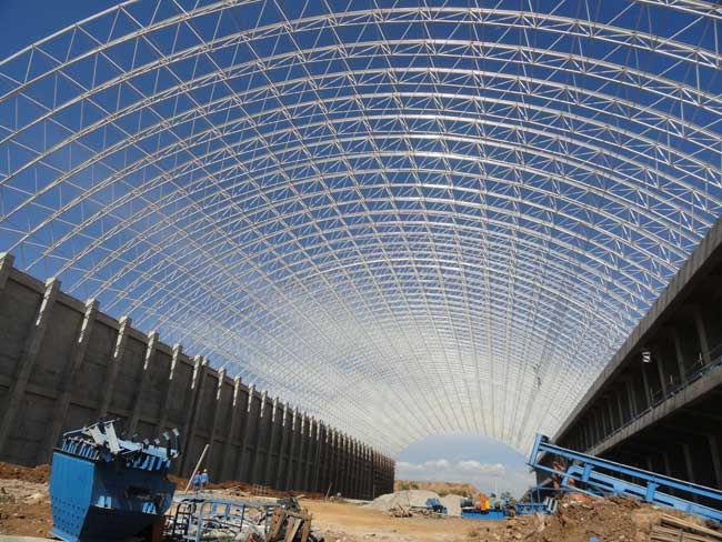 优缺点:具有空间受力、重量轻、刚度大、抗震性能好等优点;可用作体育馆、 影剧院、展览厅、候车厅、体育场看台雨篷、飞机库、双向大柱网架结构距车间等建筑的屋盖。缺点是汇交于节点上的杆件数量较多,制作安装较平面结构复杂。